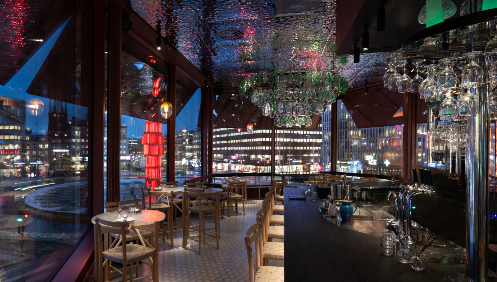 Baren är omgiven av glasfönster med en häftig vy över staden. Torget har fått sitt namn efter bildhuggaren Johan Tobias Sergel. The drink menu is.
